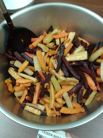 z.B. gab es: Gemüse Pommes mit einer veganen Currymajo