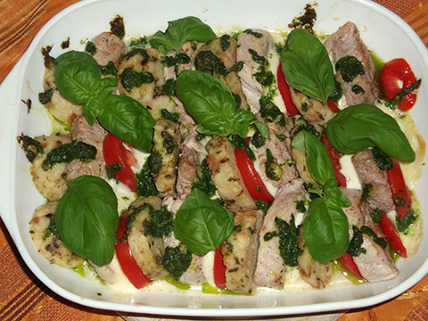 3 Semmelknödel mit Speck, 500g Tomaten, ca. 600g Schweinefilet, 250g Mozzarella, 1Bund Basilikum, etwas Rauke oder andere Kräuter, ca. 50ml Öl, 1 Knoblauchzehe, 30 g Parmesan gerieben, Salz, Pfeffer Die Semmelknödel nach Packungsanleitung kochen und auskühlen lassen. Das Schweinefilet waschen, trocken reiben, von Sehnen befreien und in ca. 2cm breite Scheiben schneiden, etwas flach drücken, […]