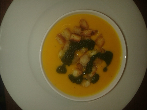 Hier die Kürbis – Kartoffelsuppe mit Weißwein, Kräuterpaste und Croutons