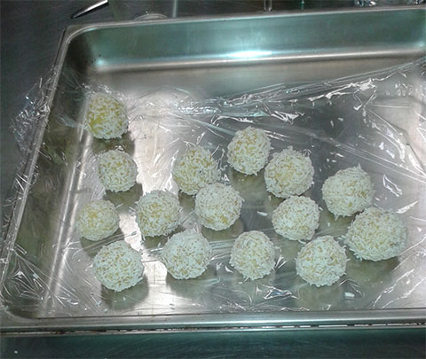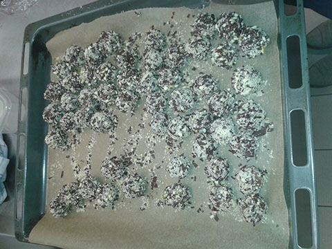 Pralinen mit einer Hülle von weißer Schokolade, verschiedenen Nussarten und Schokostreuseln….