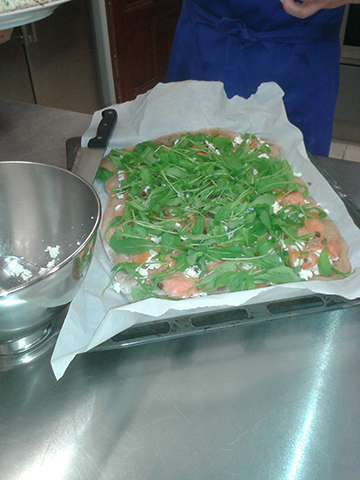 eine Dinkelvollkornpizza mit Hüttenkäse, Rucula und Räucherlachs…