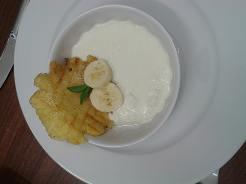 und einen lecker Nachtisch aus Labquark, Holunderblütensirup und gegrillter Ananas