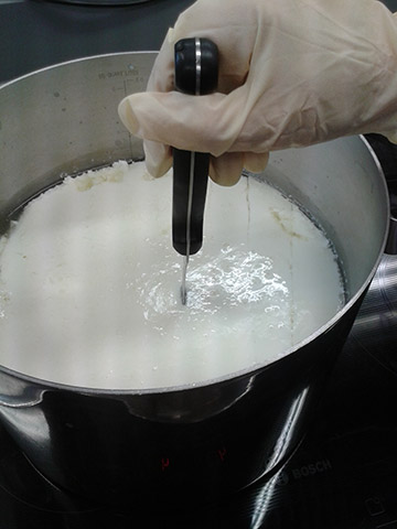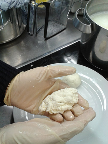 Hier wird gerade der Käsebruch geschnitten für den Mozzarella