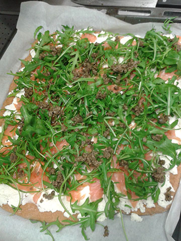 unter anderem gab es eine Dinkelvollkornpizza mit selbst gemachtem Frischkäse, Lachs, Ruccula und Kapern