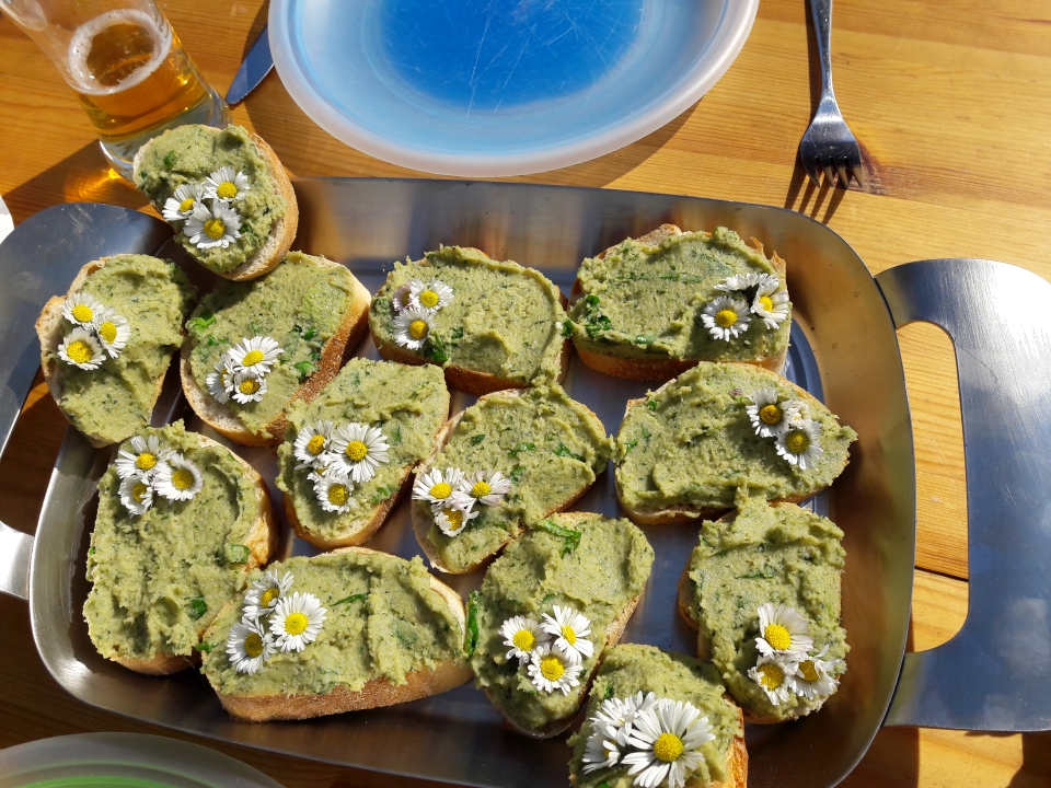 Bei schönstem Wetter trafen wir uns an der Parkeisenbahn am Auensee und gingen dann Bärlauch sammeln. Wir nahmen auch ein paar Bärlauchblütenknospen mit, ein wenig Giersch und jede Menge Gänseblümchenblüten.