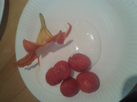 Daraus machten wir dann: Gurkensalat mit Giersch und Senfdressing, gefüllte Eier mit Brennnesseln, Wildkräuterquarkplätzchen und als Nachtisch gab es Holunderblütenquark mit Taglilienblüten und Erdbeeren. Alles war total lecker.