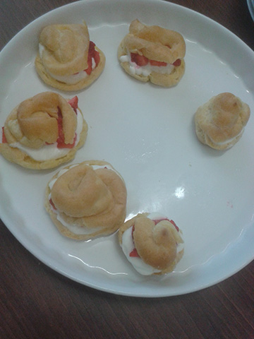 Windbeutel gefüllt mit Holunderblütenquark und Erdbeeren. Es fehlte hier nur noch Puderzucker 🙂