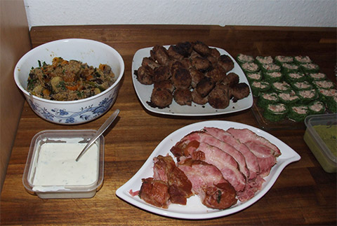 Es gab: Libanesischen Gemüsesalat mit Quiano, orientalische Hackfleischbällchen, Minzjogurt und Kassler