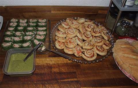 Spinat- Röllchen mit Krabbencreme – Füllung, Blätterteigschnecken mit Kräuterfrischkäse. Die eine Hälfte war mit Lachs belegt und die andere mit Schinken. Die grüne Kräutersenfsoße gab es zum Kassler dazu.