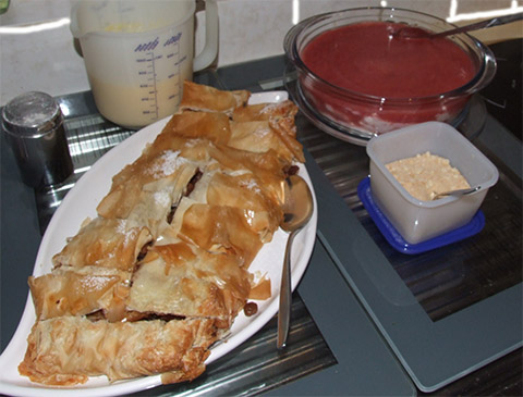 Und der Nachtisch – Apfelstrudel mit Vanillesoße und Hollerblütenquark mit Erdbeermus und Löffelbiskuit – Krümeln.